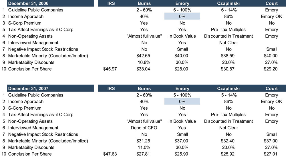The fourth appraiser was hired by the plaintiffs, apparently to shore up an IRS criticism of the Emory appraisals. Nancy Czaplinski from Duff & Phelps also provided an expert report and testimony at trial. Emory’s report had been criticized because he employed only the market approach and did not use an income approach method directly. Czaplinski used both methods. It is not clear from the decision, but it is likely that Czaplinski was not informed regarding the conclusions in the Emory reports prior to her providing her conclusions to counsel for plaintiffs.