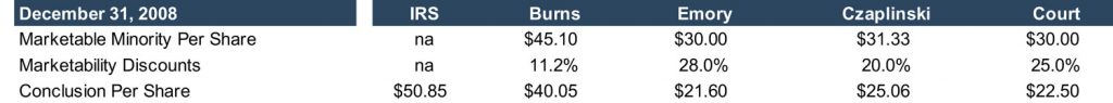 The Emory report concluded that the marketability discount should be 28% for the December 31, 2008 appraisal (where previously, it had been 30%). The discount in the Czaplinski report was 20%. The marketability discount in the Burns report (for the IRS) was 11.2%.