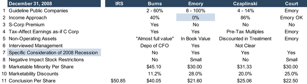 As I read the court’s decision, there were ten items that were important in all three appraisals, and an additional item that was important in the December 31, 2008 appraisal. Readers will remember the Great Recession of 2008. It was important to the court that the appraisers consider the impact of the recession on the outlook for 2009 and beyond in their appraisals for the December 31, 2008 date.