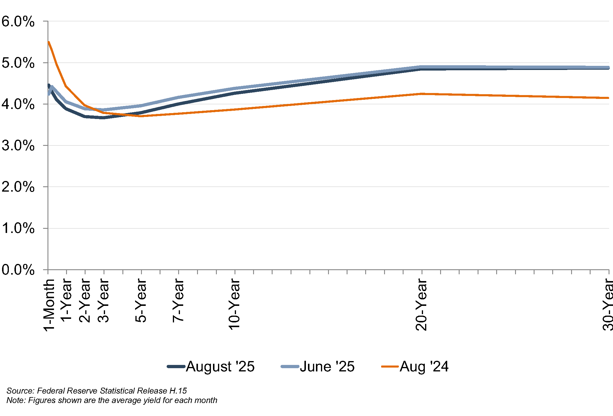As shown in Figure 1, on the previous page, the yield curve for U.S. Treasuries has shifted downward relative to last year at this time for terms of less than five years, and the market expects further downward movement in short-term rates in the near-term.