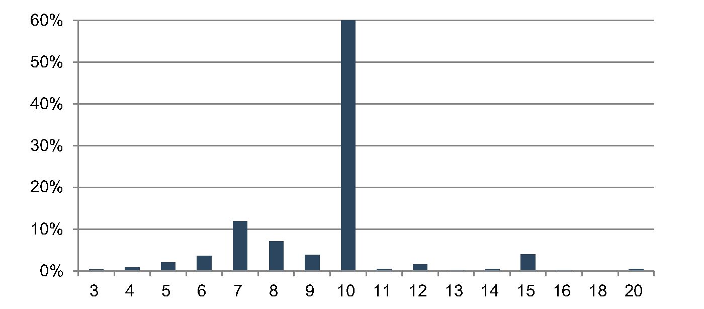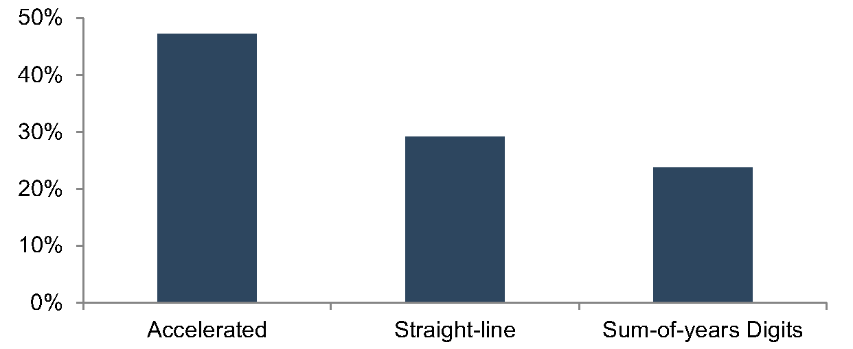 Based on the data for acquisitions for which core deposit intangible detail was reported, a majority of banks selected a ten-year amortization term for the CDI values booked. Less than 10% of transactions for which data was available selected amortization terms longer than ten years. Amortization methods were somewhat more varied, but an accelerated amortization method, including the sum-of-the-years digits method, was selected in approximately two-thirds of these transactions.