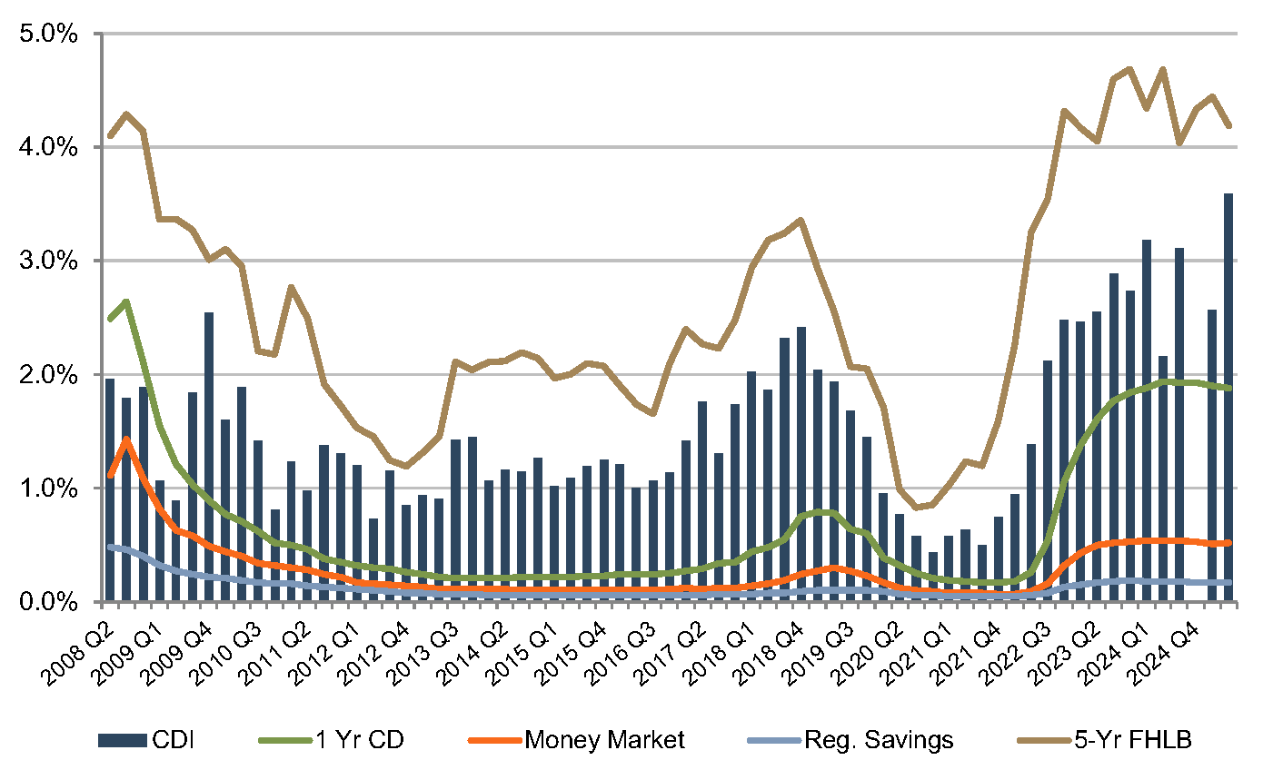 As shown in Figure 3, reported CDI values have followed the general trend of the increase in FHLB rates. However, the averages should be taken with a grain of salt. The chart is provided to illustrate the general directional trend in value as opposed to being predictive of specific indications of CDI value due the following factors: