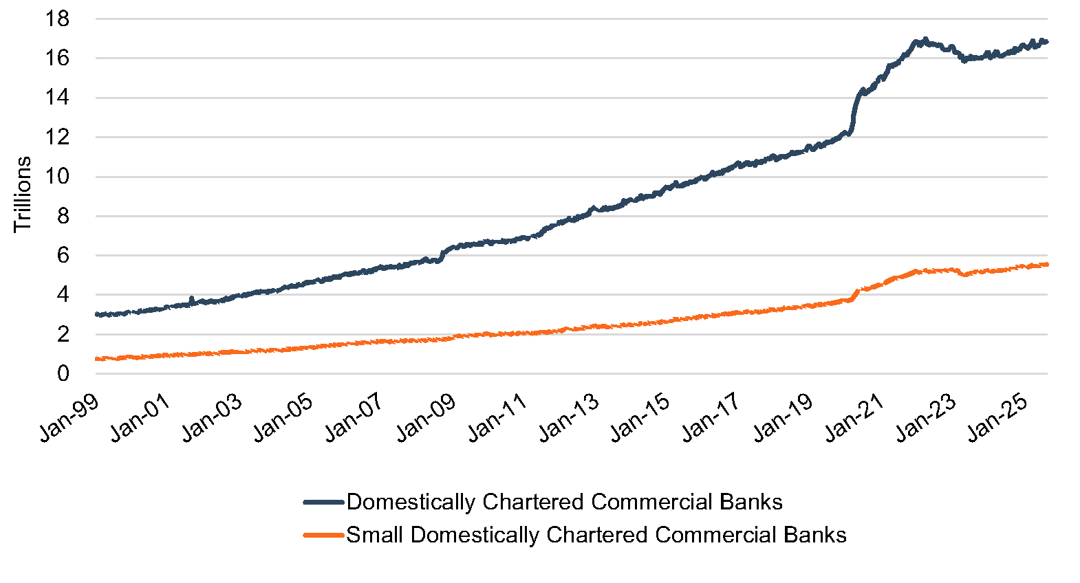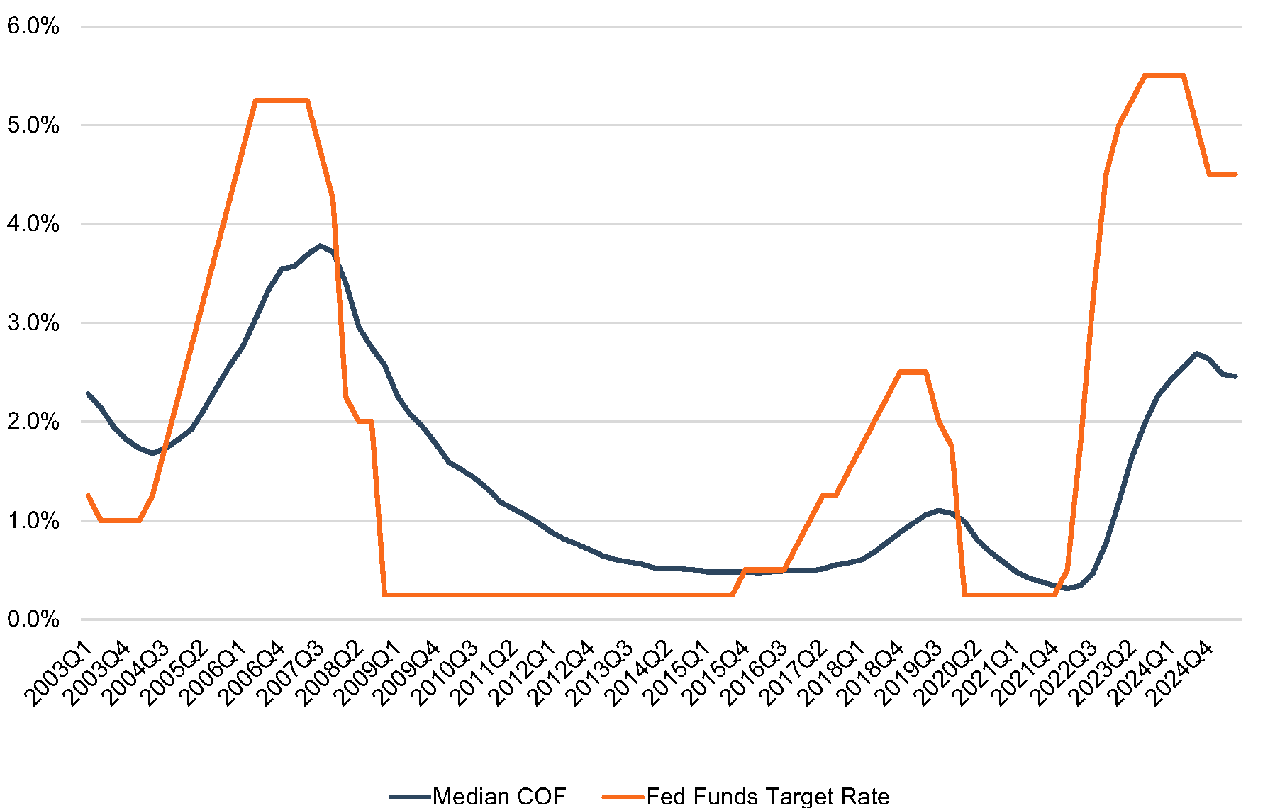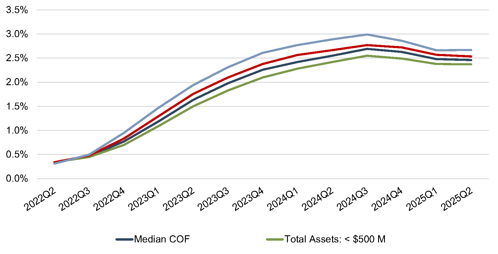 While many factors are pertinent to analyzing a deposit base, a significant driver of value is market interest rates. All else equal, lower market rates lead to lower core deposit values. In its September 2024 meeting, the Federal Reserve reduced the target federal funds rate by 50 basis points. This was the first downward adjustment since the FOMC began increasing rates in March 2022. In its third and fourth quarter 2024 meetings, the Federal Reserve reduced the target federal funds rate by 25 basis points at each meeting. After several quarters of steady rates, an additional 25 basis point reduction occurred in the September 2025 meeting. These cuts left the benchmark federal funds rate in a range between 4.00% and 4.25%.