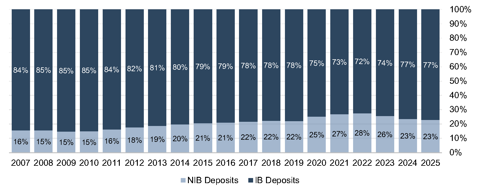 Using data compiled by S&P Global Market Intelligence, we analyzed trends in core deposit intangible (CDI) assets recorded in whole bank acquisitions completed from 2000 through mid-September 2025. CDI values represent the value of the depository customer relationships obtained in a bank acquisition. CDI values are driven by many factors, including the “stickiness” of a customer base, the types of deposit accounts assumed, the level of noninterest income generated, and the cost of the acquired deposit base compared to alternative sources of funding. For our analysis of industry trends in CDI values, we relied on S&P Global Market Intelligence definition of core deposits. In analyzing core deposit intangible assets for individual acquisitions, however, a more detailed analysis of the deposit base would consider the relative stability of various account types. In general, CDI assets derive most of their value from lower-cost demand deposit accounts, while often significantly less (if not zero) value is ascribed to more rate-sensitive time deposits and public funds. Non-retail funding sources such as listing service or brokered deposits are excluded from core deposits when determining the value of a CDI.