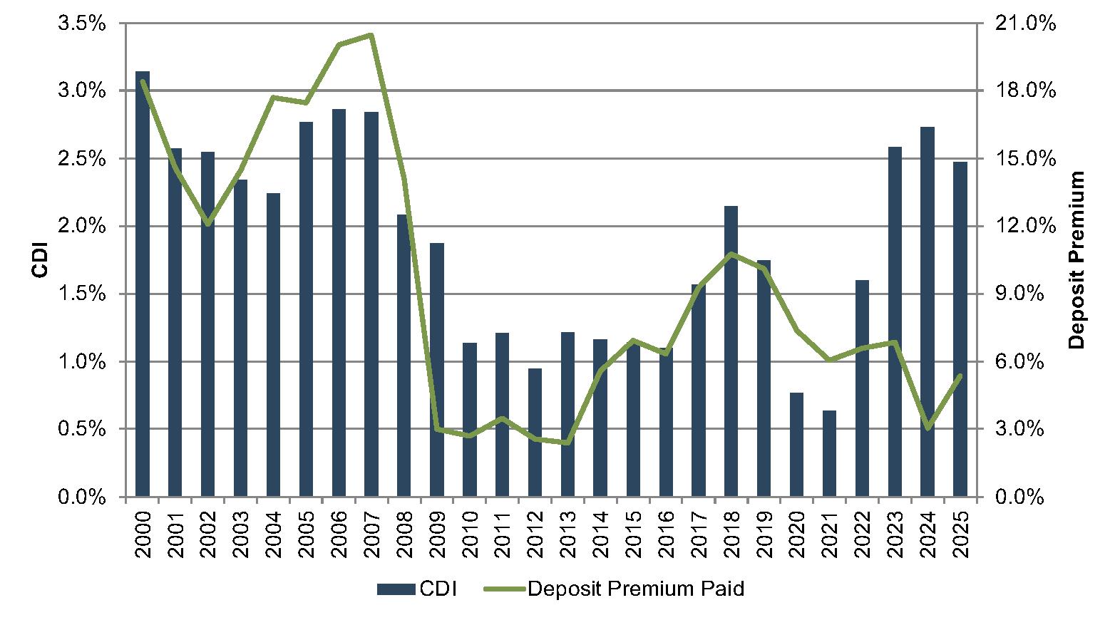 CDI values have been somewhat flat compared to last year, averaging 2.47% through mid-September 2025. Excluding one transaction with an unusually low core deposit intangible ratio, the average is closer to 2.70%. This compares to a 2.73% average for all of 2024, 2.58% for 2023, 1.60% for 2022 and 0.63% for 2021. Recent values are above the post-recession average of 1.53%, and on par with longer-term historical levels which averaged closer to 2.5% to 3.0% in the early 2000s.