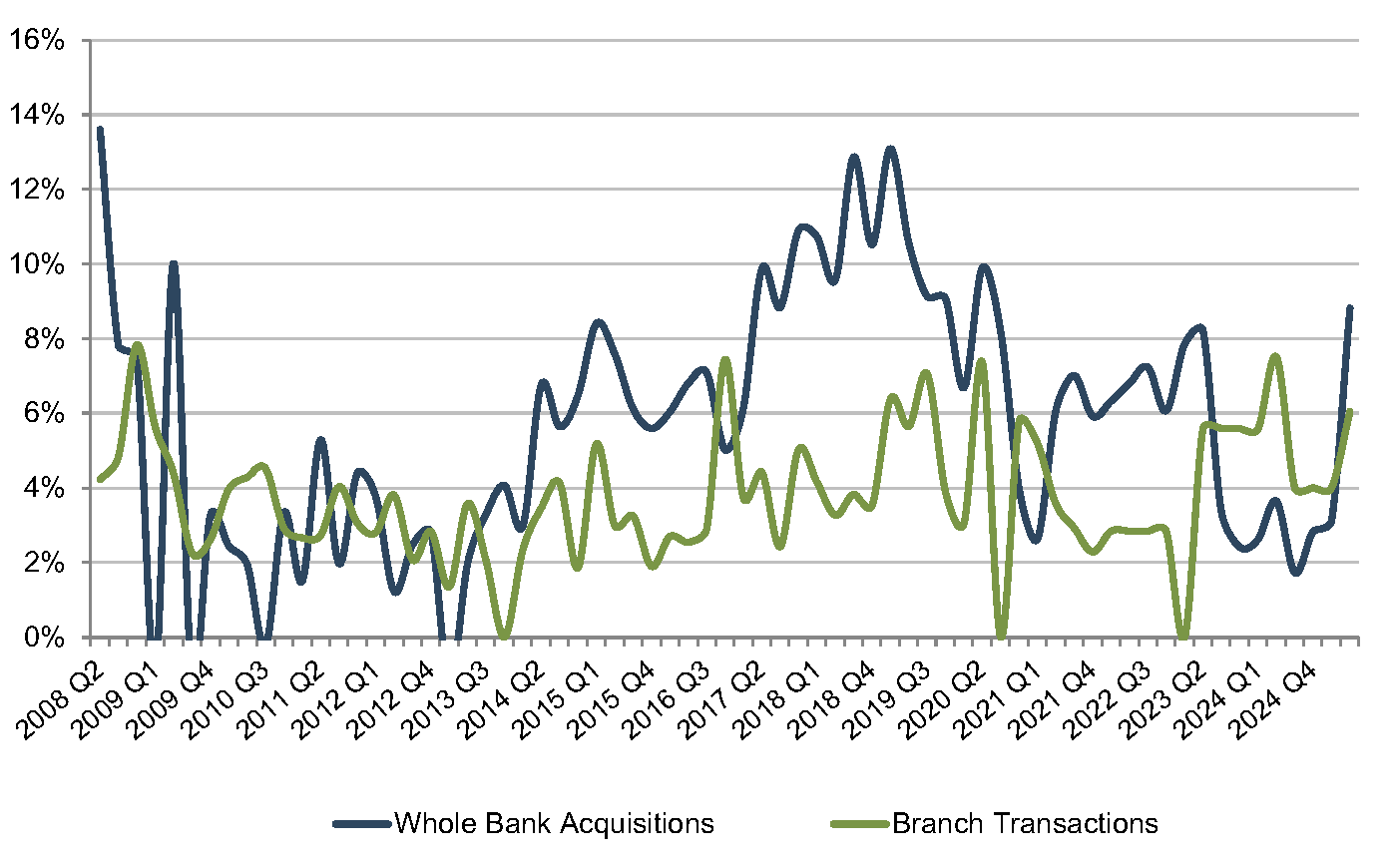 Deposit premiums paid in branch transactions have generally been less volatile than tangible book value premiums paid in whole bank acquisitions. Only three branch transactions with reported premium data have occurred year-to-date in 2025. For those transactions, the deposit premiums were 7.0%, 4.6%, and 7.5%. The same number of branch transactions with reported premium data occurred in 2024, and the premiums were similar. The lack of branch transactions, though, is indicative of their value. With high short-term funding costs and tight liquidity, few banks have been willing to part with stable, low cost core deposits.