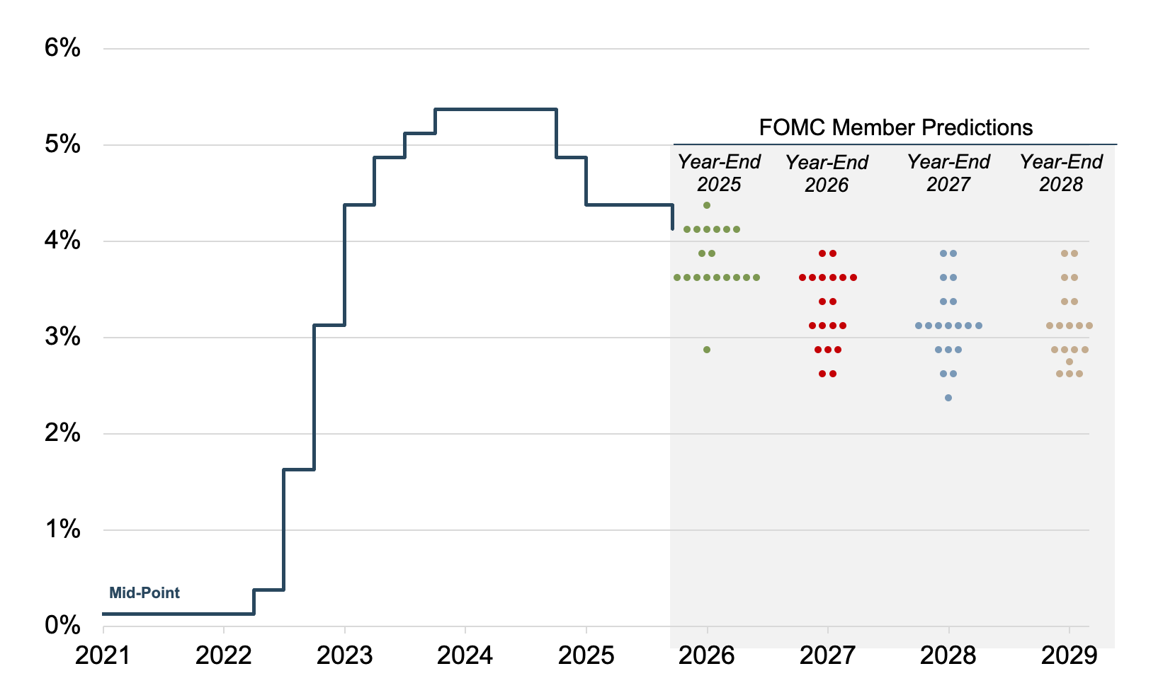 The Federal Reserve’s “dot plot”, presented in Figure 2, on the previous page, exhibits a wide dispersion of expectations for the near term, especially for 2026. Although the magnitude of future adjustments to the target rate is unclear, the expectation is clearly for lower rates.