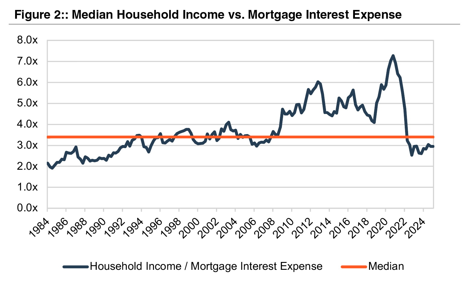 Mortgage rates were around 20% briefly in the early 1980s. Conversely houses were much cheaper. The analysis in Figure 2, on the next page, compares mortgage interest expense (using 30-year average mortgage rates and median U.S. transaction prices) to median household income, since the early 1980s.
