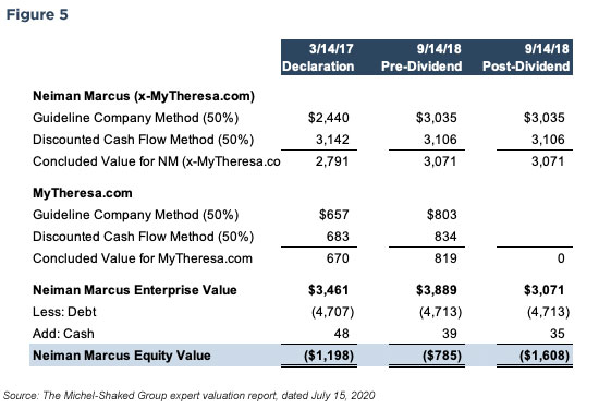 Since the bankruptcy filing occurred, the unsecured creditors commissioned a valuation expert to review the transaction to determine whether Neiman Marcus was solvent as of the declaration date, immediately prior to the distribution and after the distribution. As shown in Figure 5, the creditors’ expert derived a negative equity value on all dates. If the court accepted the position, then presumably Ares and CPPIB would be liable for fraudulent conveyance.