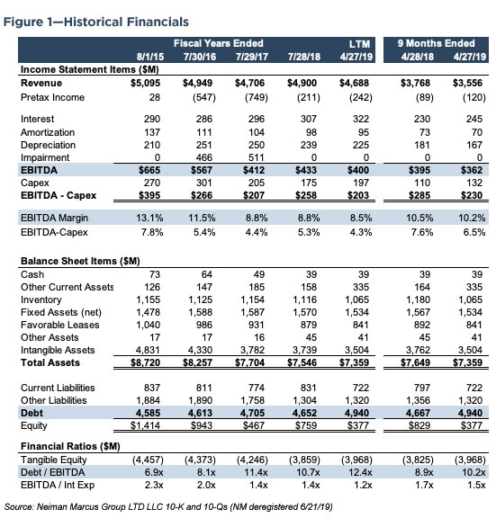 Neiman Marcus has struggled with a high debt load since the first LBO in 2005, which has been magnified by the disruptive impact that online retailing has had on department stores. EBITDA declined from $665 million in FY2015 to $400 million in the LTM period ended April 27, 2019; the EBITDA margin declined by over a third from 13.1% to 8.5%, over the same time. By April 2019, debt equated to 12.4x LTM EBITDA and covered interest expense by 1.2x. By way of reference, the debt/EBITDA and EBITDA/interest ratios for Ralph Lauren (NYSE: RL) for the fiscal year ended March 30, 2019, were 1.0x and 47.1x, while the respective ratios for Dillard’s (NYSE: DDS) were 1.2x and 9.9x for the fiscal year ended February 2, 2019.