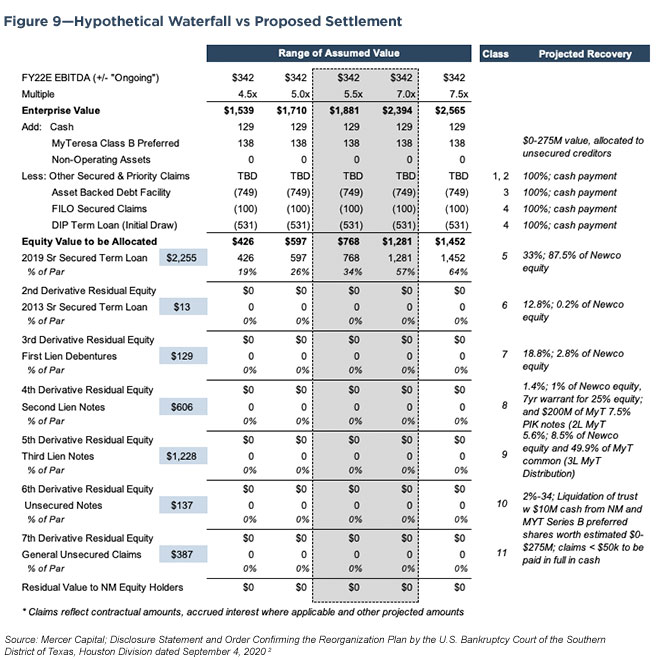 In Figure 9 we have constructed a waterfall analysis which we compare with the actual settlement. We assume a range of enterprise values based upon multiples of projected FY22 EBITDA, or $342 million, and compare the residual equity after each claimant class is settled to provide perspective on the creditors’ recovery.