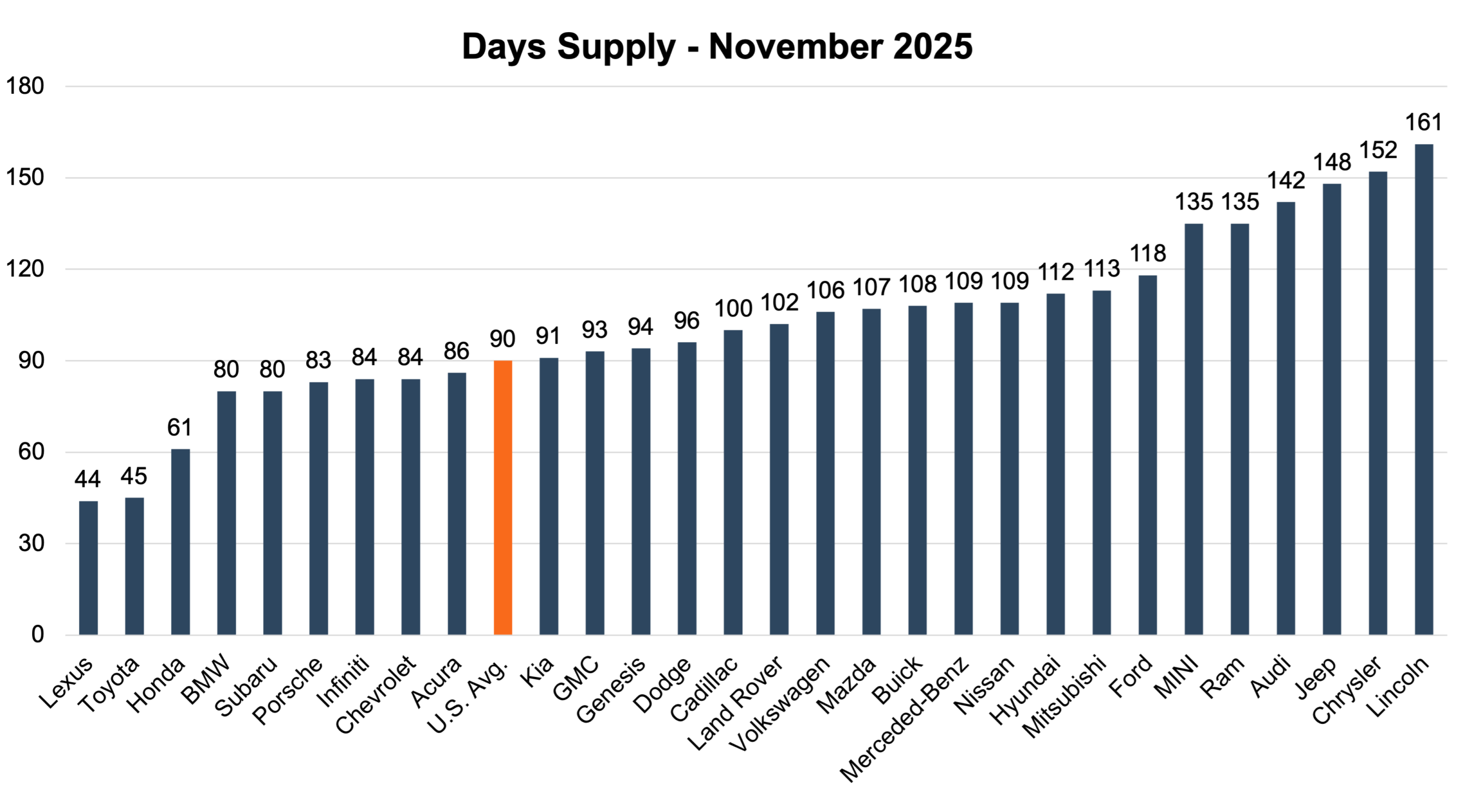Inventory management remains a key differentiator among OEMs. Evaluating franchise value now requires a closer examination of how effectively a brand maintains operational steadiness. From October 2025, there was not a material change in days’ supply with the U.S. average edging up 2 days. Days’ supply increased the most for brands on the opposite ends of the spectrum. Lexus and Toyota’s increases can be seen as normalization though they are still well below peer figures. On the other end, brands with elevated inventory levels (VW, CDJR, Mini and Lincoln) also saw their days’ supply increase, which is putting pressure on margins and working capital. No other brands saw their days’ supply change by more than a few days up or down.