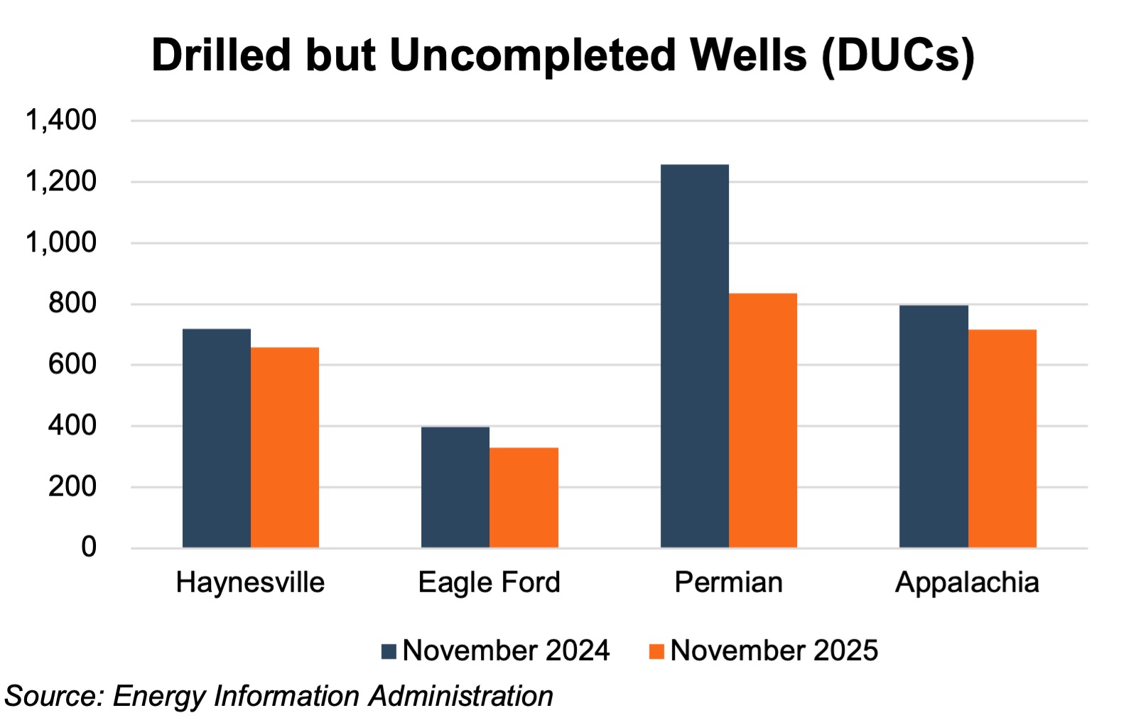 The ability of Haynesville production to grow despite reduced drilling activity reflects ongoing efficiency gains and the continued drawdown of drilled but uncompleted wells (DUCs). Operators relied on previously drilled inventory and completion optimization to maintain production volumes even as rig counts declined. While this dynamic supported near term output, sustained production growth in the basin will depend on a more durable improvement in natural gas pricing and a corresponding increase in drilling activity.