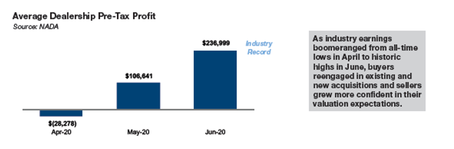 As we mentioned above, deal activity from March through May was paused for numerous reasons. First, having to perform the due diligence process virtually reduces the likelihood of a transaction between two parties that don’t know each other well, even if both sides were eager to press forward. Widening gaps in valuations between buyers and sellers also made sellers less likely to relinquish their assets in a spiraling economic climate at the onset of the virus. After all, for many families, their auto dealership is the principal asset on the family balance sheet, and owners were wise to hold tight to their assets in a spiraling economic climate.
