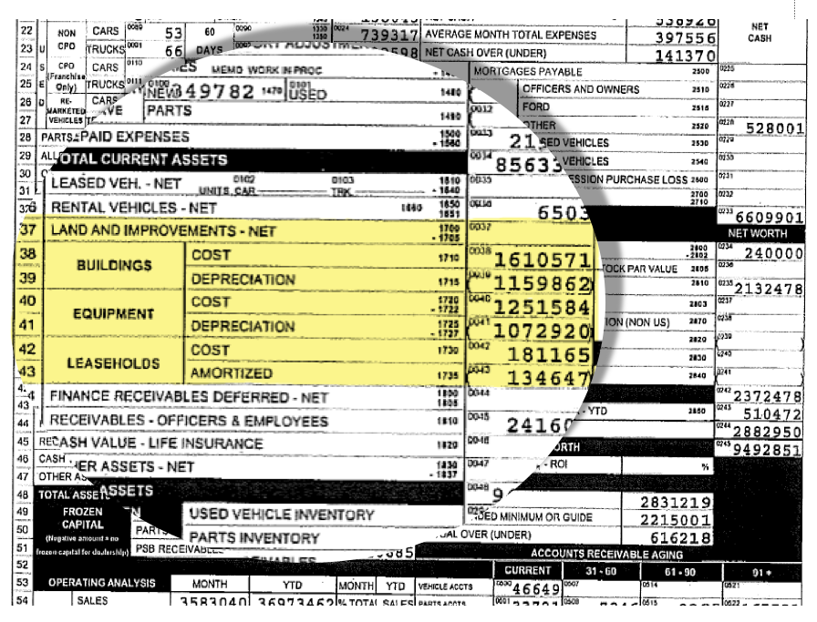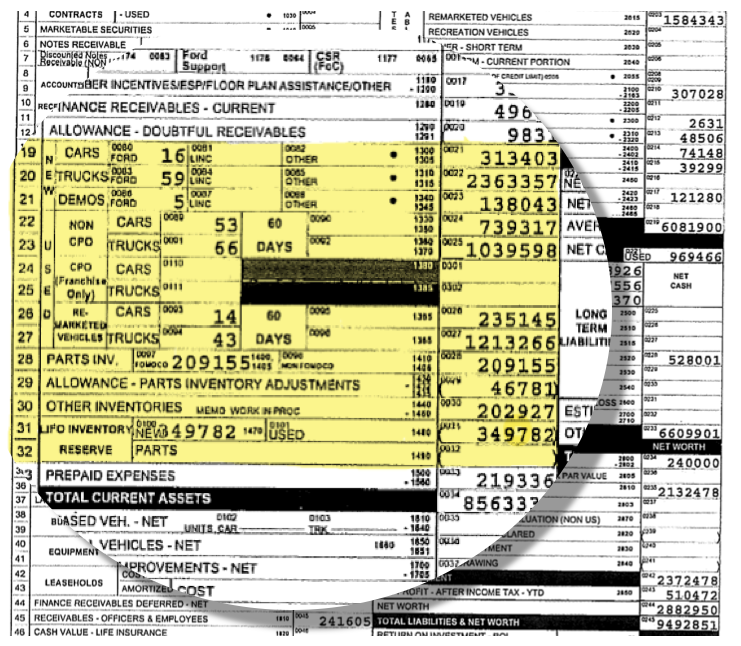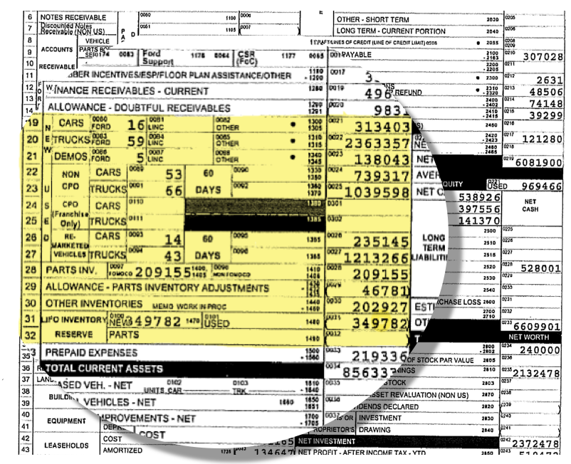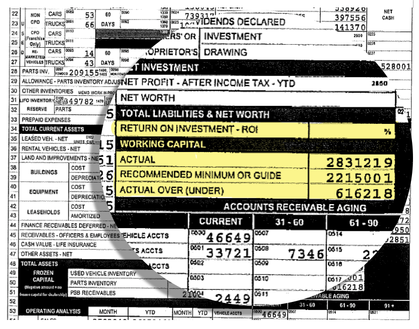 Most factory dealer financial statements list the dealership’s actual working capital, along with the requirements from the factory on the face of the dealer financial statement, as seen in the graphic to the right. It’s important for the business valuation expert to assess whether the dealership has adequate working capital, or perhaps an excess or deficiency. Comparisons to required working capital are not always rigid. An understanding of the auto dealer’s historical operating philosophy can help determine whether there is an excess or deficiency as different sales strategies can require different levels of working capital, regardless of the factory requirements.