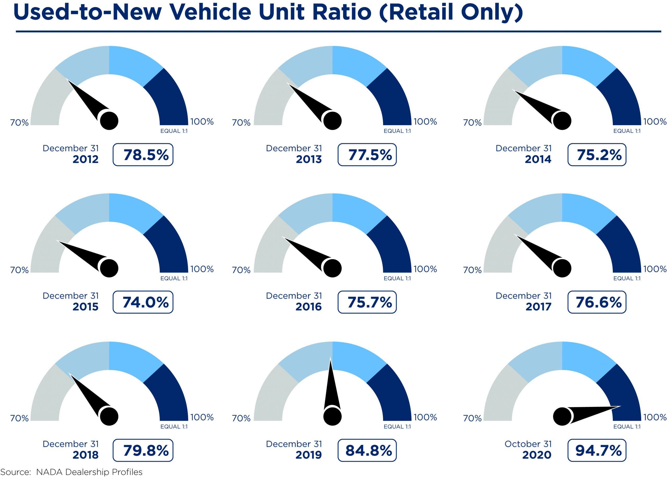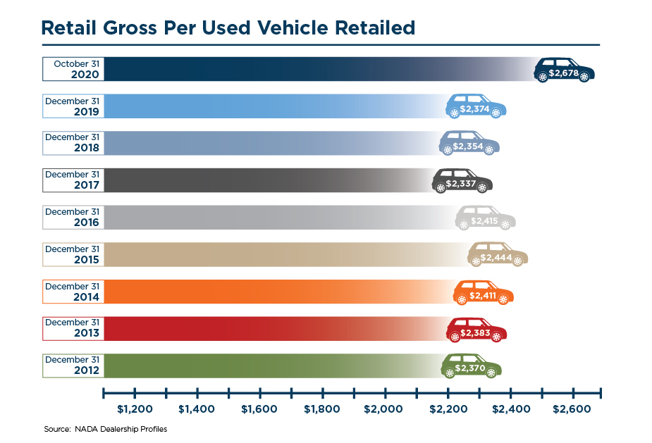 In a strange year of oddities, 2020 has all of us constantly evaluating life’s basic truths. Market conditions vary drastically across all industries and even geographically within the same industry due to local government restrictions.  It’s critical for auto dealers to continually analyze all aspects of their business and be ready to capitalize on industry trends.  We previously discussed the use of the NADA dealership profiles as a useful tool to examine timely monthly data based on averages or dealership type.  Three specific metrics in the data have reached their highest level since the data was originally published in 2012: new vehicle retail gross profit per unit, used vehicle retail gross profit per unit, and used-to-new vehicle unit ratio.