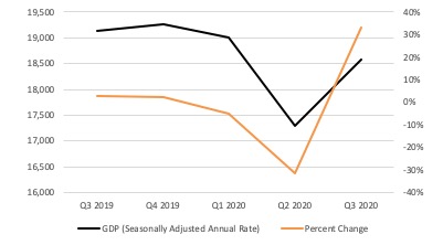 Earnings growth must also be evaluated in the context of pre-pandemic levels, not just improvement from the bottom. The recent pattern in GDP growth is a good example of this. In Q3, GDP increased an impressive 33.1%, after having fallen 31.4% in Q2. While 33.1% is greater than 31.4%, we can see in the graph below that GDP has not fully recovered.