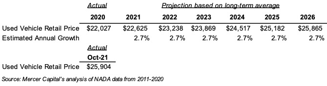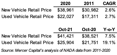 According to our analysis of NADA data from 2011 to 2020, used vehicle retail prices increased at a compound annual rate of 2.7%, just above the 2.6% increase for new vehicles. In 2021, used vehicle prices lurched forward faster than new vehicles. New vehicle prices increased 7.5% in the last twelve months due in part to supply shortages. Consumers who couldn’t get the new vehicle they wanted or realized they needed a car, but prices were too high, may have turned to used vehicles, whose prices increased 19.1% due to increased demand.