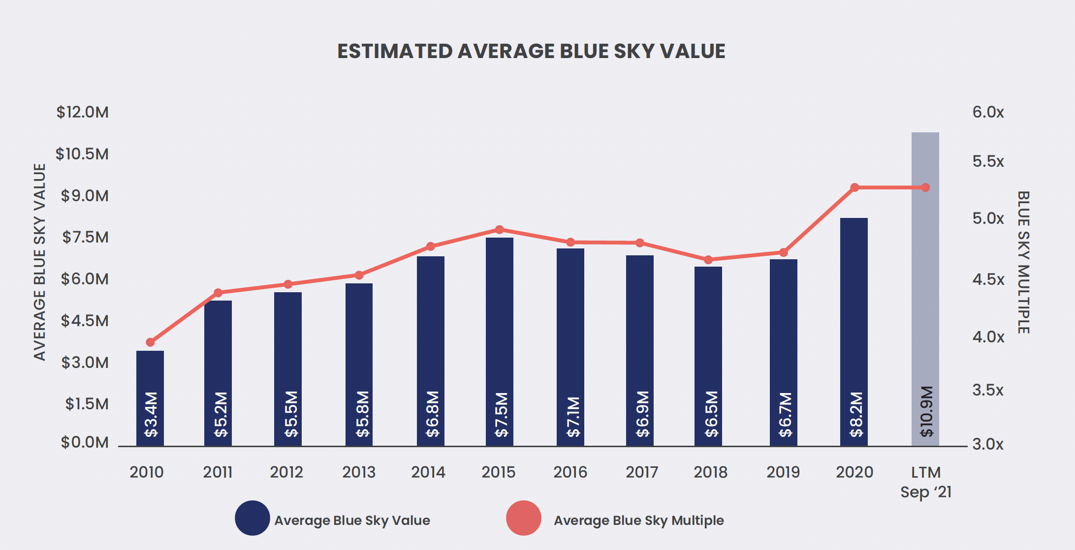 According to the Q3 2021 Haig Report, the average franchise has a Blue Sky multiple of 5.24x and adjusted pre-tax earnings of $2.08 million for a Blue Sky value of about $10.9 million, up 61% from year-end 2019 to all-time highs. At these prices, buyers must be optimistic that the good times will continue, multiples won’t crater, and/or the new normal of profits will be higher than historical levels.