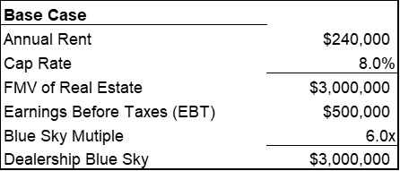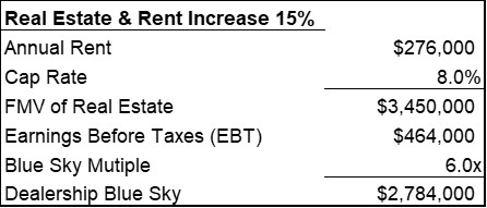 Based on the assumptions above, the dealership operations would have a value of $3,000,000 (EBT of $500,000 times a Blue Sky multiple of 6x) and the real estate would have a value of $3,000,000 for a total acquisition value of $6,000,000 as seen below.