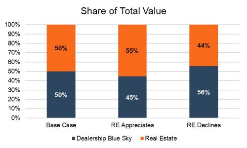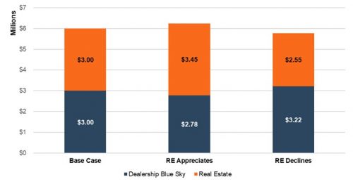 Why would dealers want to shift value and/or rental income to the real estate entity? Let’s examine this through an example highlighting increasing real estate values and one highlighting decreasing real estate values.