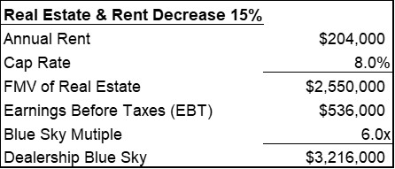 Now let’s examine the alternative where real estate values are declining. Let’s assume that the fair market value of the real estate declines by 15% to $2,550,000. If annual rent is kept at a constant capitalization rate of 8% with more of a long-term view, annual rent would decrease to $204,000 and the resulting decrease in rent would increase normalized earnings to $536,000. While the real estate value declines, the implied blue sky value for the dealership operations increases since earnings are higher due to decreased rent. However, the overall total acquisition (operations + real estate) would decrease by 4% ($5,766,000 vs. $6,000,000) despite the 7% increase in blue sky value seen below.