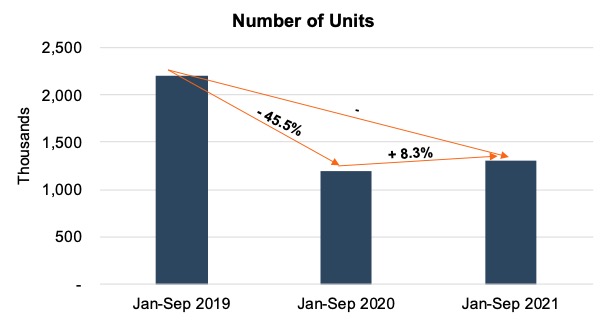 The graphic below depicts total fleet sales from January through September for 2019, 2020, and 2021 as reported by Cox Automotive.  While total fleet units are up slightly in 2021 from the same period in 2020, this figure is misleading when viewed in the context of more normal fleet sales in 2019.  In fact, current year-to-date fleet sales are down nearly 41% over 2019 figures.