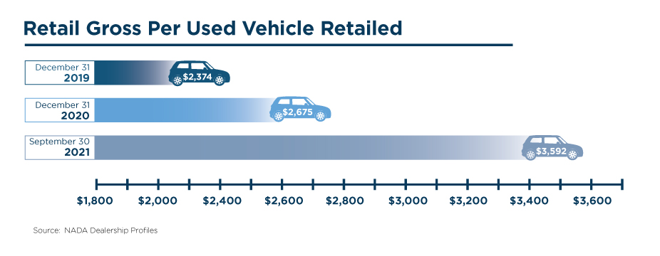 Of the department/profit centers for an auto dealership, historically, the new and used vehicle departments accounted for the largest contribution to revenue, but a substantially lower contribution to overall gross profit.  According to the Average Dealership Profile from NADA, these departments typically comprised approximately 88-90% of revenues and approximately 52% of gross profits, with the remainder coming from fixed operations.  Currently, these departments still comprise a similar percentage of total revenues but now comprise 60% of gross profits. This figure continues to climb as of September 2021 as reported by NADA. What is driving this increase?  Rising transaction prices for used vehicles and, in turn, increased gross profit per unit (GPU).  The graphic below details the current used vehicle GPU and the corresponding figures from the prior two year-ends.