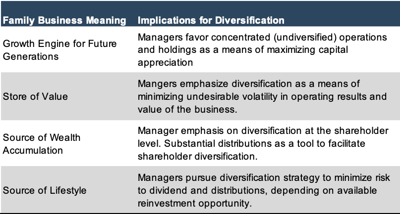Family businesses often provide a different ‘who’ regarding diversification and a different ‘why’ to their publicly traded, non-family controlled counterparts. What the family business means to you impacts how you think about diversification decisions for the family business.