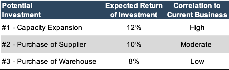 Diversification is simply investing in multiple assets as a means of reducing risk. Suppose one asset in the portfolio takes a big hit. In that case, some other segment of the portfolio will likely perform well at the same time, thereby blunting the negative impact on the overall portfolio. A big question when considering diversification is a correlation: if what you are investing in is closely tied to your business currently, diversification benefits are blunted. The following example illustrates the two sides of the equation when diversifying expected returns and correlation.