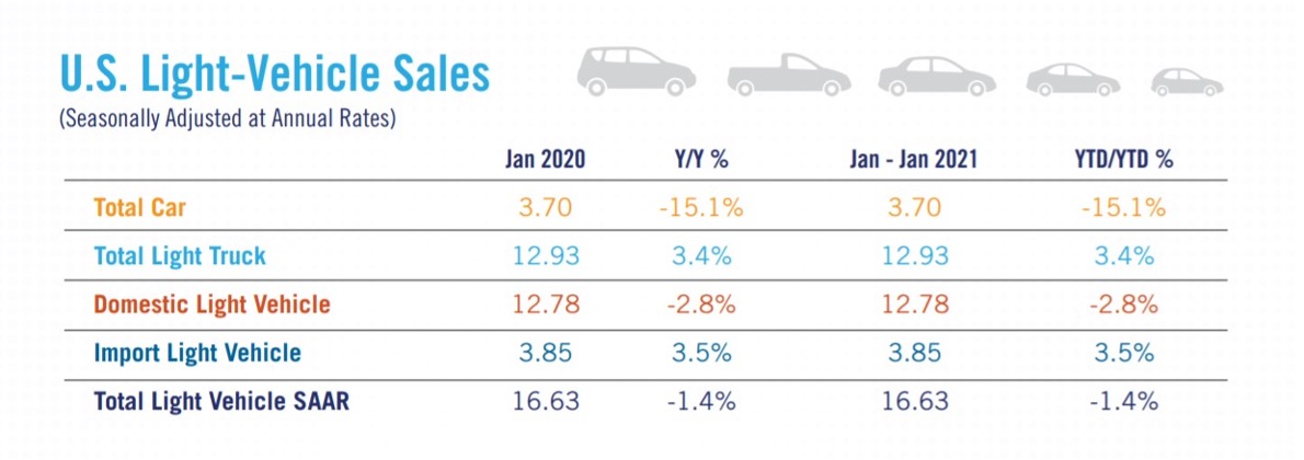Thomas King, president of the data and analytics division at JD Power noted this about January SAAR: “January continues the strong performance observed in Q4 of 2020 and points to a positive outlook for the balance of 2021. The growth in retail sales is encouraging, especially as it is being achieved with higher transaction prices and lower incentive levels. While retail demand remains strong, non-retail sales are still recovering, which is hampering total vehicle sales and SAAR.”