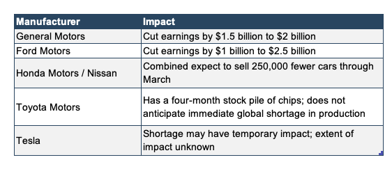 As recently mentioned on this blog, the chip shortage is a pervasive issue for auto dealers going forward. According to LMC Automotive, the global chip shortage is expected to reduce North American production by some 230,000 units in the first quarter. For perspective, multiplying this by 4 for a simple annualization would reduce 2021 volumes by nearly 1 million.  Consulting firm AlixPartners expects the shortage will cut $60.6 billion in revenue from the global automotive industry. Different manufacturers are anticipating different levels of impact (see table below).