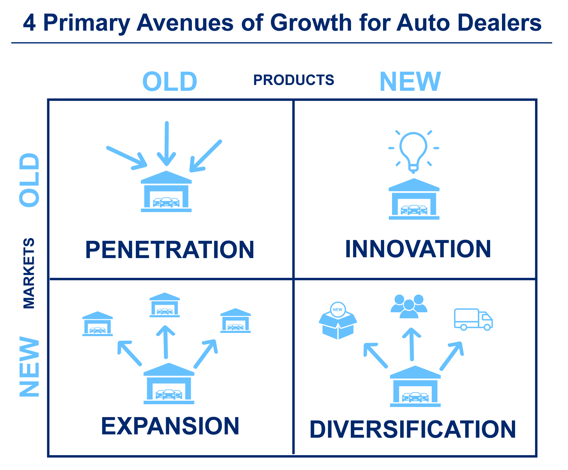 - Innovation (new product, same customers: to offer in their existing footprint or additional sales channels). This can be somewhat limited for auto dealers as OEMs exert control over what vehicles are produced. However, dealer principals can improve their product offering by adding new rooftops, whether connected to their existing footprint, or nearby. There are also opportunities to introduce or refine the suite of F&I products offered to consumers.