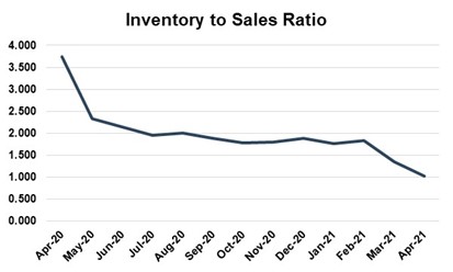 “Looking forward to June, with sales continuing to outpace production in aggregate, falling inventory levels may start to put pressure on the current sales pace. However, based on what we have seen so far, retailers may continue to adapt by turning inventory more quickly to maintain sales velocity. However, regardless of inventory position, manufacturers and retailers will continue to benefit from strong consumer demand and a higher profit per unit sold.”