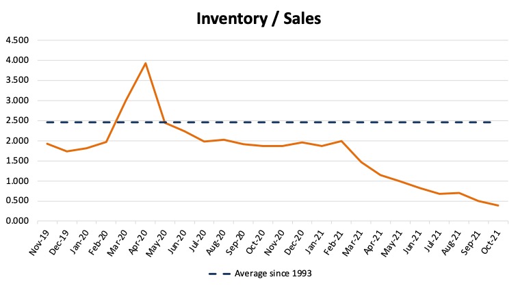 While December is typically a big selling month for dealers, we don’t see much changing the supply issues in the next couple of weeks to close out 2021. From a dealer’s standpoint, inventories will most likely continue to be sold within days of arriving on the lot.