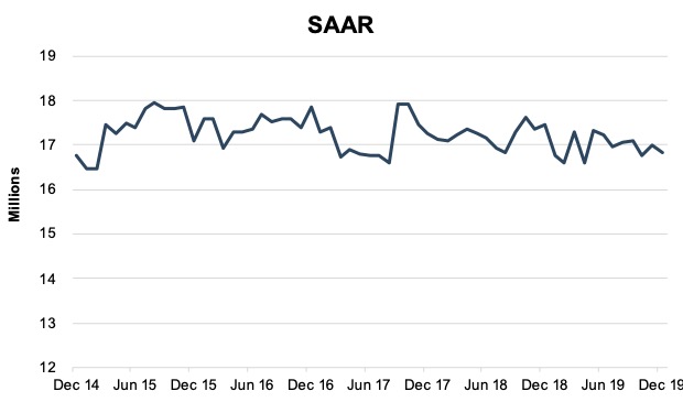In the Q4 2017 Haig Report, private dealership values were judged to have fallen by an estimated 2.6% from the year-end 2016 due to increased expenses. Despite generally favorable macroeconomic conditions in the U.S., auto sales and gross profit per vehicle retailed were starting to trend down at the same time that dealership expenses are increasing, reducing profits. With years of annual volumes above 17 million, there were concerns about declines. While volumes in 2018 and 2019 were below the 2016 peak, they remained above 17 million. SAAR for 2015 through 2019 is shown in the below graph for perspective.