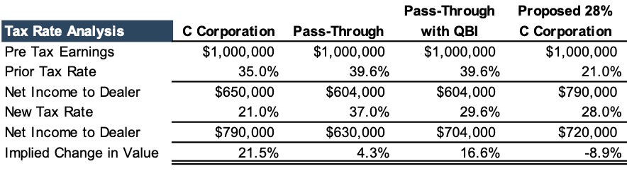 Under the Biden plan, a 28% corporate tax rate would decrease after-tax earnings for C corporations by 8.9% all else equal. However, as we saw after the TCJA, not all else is equal. The reverse may be occurring in 2021 with rising taxes being offset by more favorable industry conditions as many auto dealers finished 2020 with record profits despite a global pandemic.