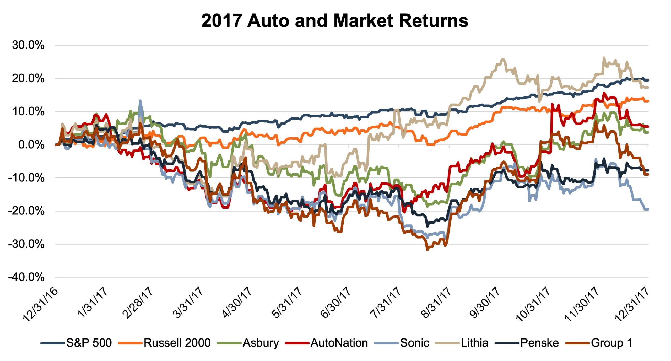 As the pandemic reminded us all, volumes do not directly correlate with profits. In order to gain a broader perspective of the auto dealer market conditions, we’ve considered the stock price returns of the S&P 500, the Russell 2000, and the publicly traded franchised dealers in 2017.