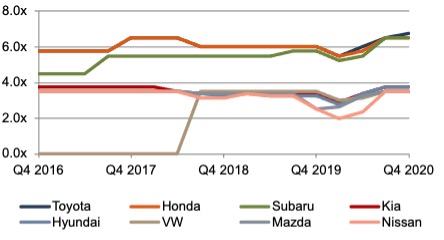 In Q1, virtually every brand covered in the Haig Report saw a decline in their Blue Sky multiple. Fortunately, as SAAR rebounded, heightened levels of uncertainty abated, and dealers and the country at large embraced and adapted to the new normal, valuations partially recovered in Q2. With reduced uncertainty and higher profits, every brand except Volvo and VW received a higher blue sky multiple in Q3 2020 than Q4 2019 (pre-pandemic). In Q4 2020, the only multiple range that changed was that for Toyota which crept into the lead for mid-line imports.