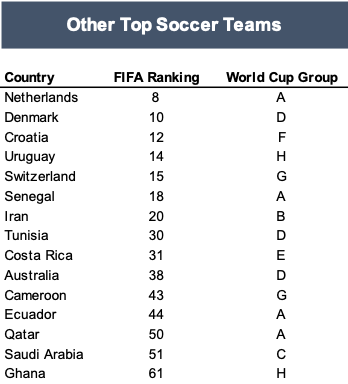 Now that we have looked at World Cup participant nations’ auto production industries let’s look at nations that did not qualify. While China and India have no significant soccer history, some high-level soccer teams are also top car producers, including Russia, the Czech Republic, Slovakia, Turkey, and Italy. See the table "Other Top Car Producers" for the OICA rankings of the nations that missed out on this year’s contest in Qatar. Russia hosted the 2018 World Cup and advanced to the knockout stages but was disqualified from the 2022 tournament given the ongoing conflict with Ukraine, who failed to qualify after a 0-1 loss to Wales (which was delayed due to the war). Perhaps the biggest shock to the casual observer is the omission of Italy, who won the World Cup in 2006 and the European Championships in 2020. A poor showing in the notoriously difficult European qualifying process ended for Italy after a shocking loss to tiny North Macedonia, who went on to lose to Portugal in the playoff.