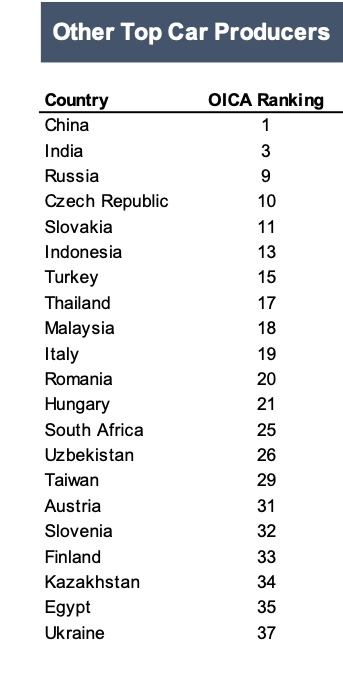 The table below shows all 32 countries in the World Cup that are also captured in the reported 37 largest global auto producers for 2022.