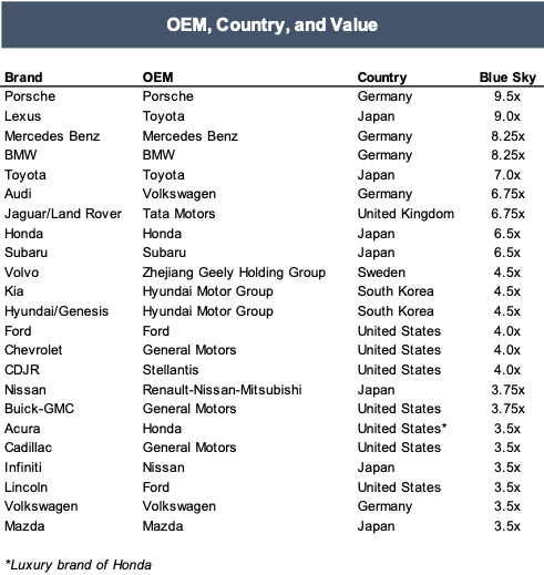 Below, we’ve tabulated major brands in the U.S. market, sorted by Blue Sky value according to the Q3 Haig report. We’ve included the OEM for each brand and their home country.