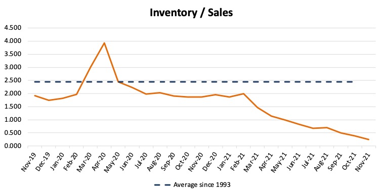 December inventory levels remained low. As a result, the industry’s inventory to sales ratio took another step down from 0.39 in October to 0.24 in November. There should be some incremental gains in inventory levels throughout 2022, but the exact point at which the supply chain tide will turn is still unknown. As far as auto sales are concerned, the pace remained red hot. High consumer demand for vehicles continued to empty lots around the country in December. In fact, in spite of the last six month’s conditions, 2021 new light sales totaled 14.93 million units, up 3.1% from 2020’s 14.47 million. When looking back at the past year in auto, it seems likely that 2021 sales of new light vehicles could have easily climbed to 17 million units in an unrestricted environment given the strong demand.
