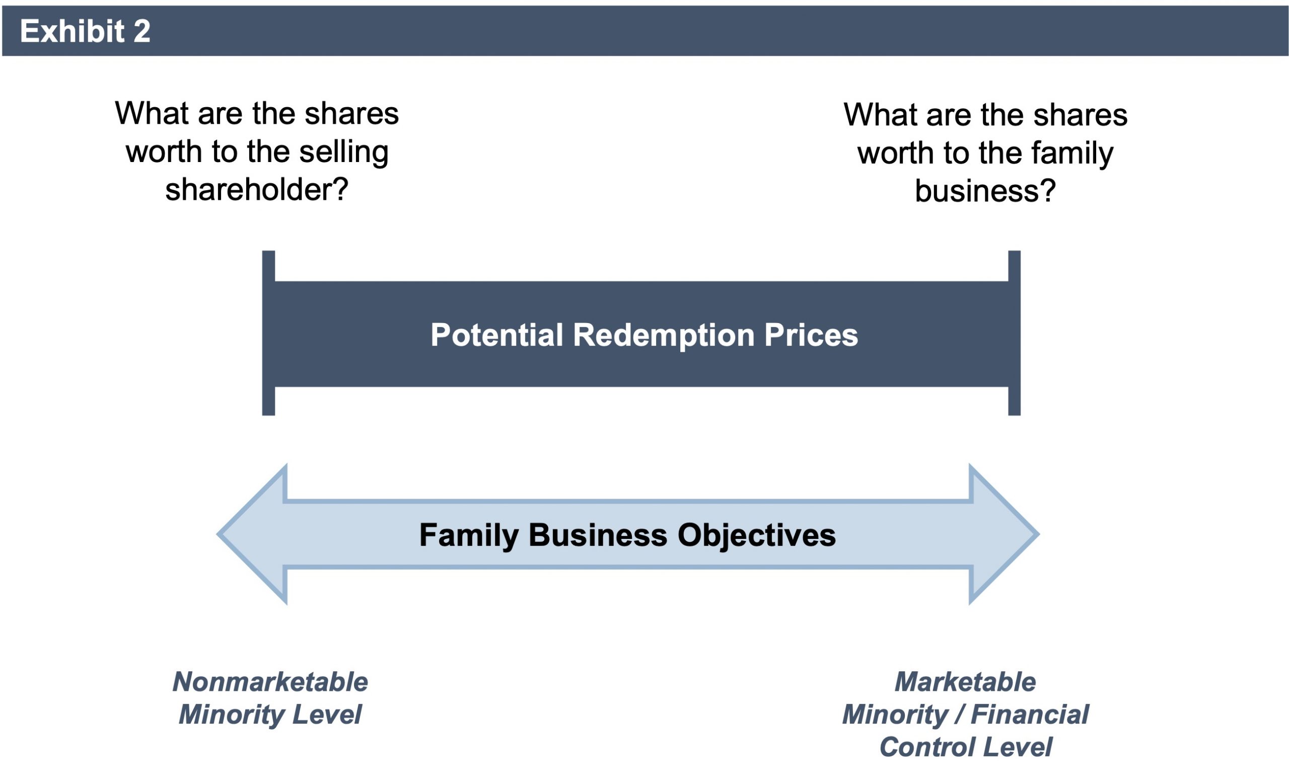 However, in a shareholder redemption transaction, the buyer is not a hypothetical party, but the company that issued the shares in the first place. The family business is not burdened by the illiquidity of the shares in the same way a shareholder is. As a result, the value of the shares to the family business is consistent with the marketable minority level of value.