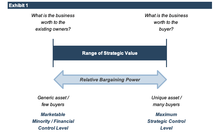 When divesting a business, the dynamics are reversed. The relevant negotiating range is set by the difference between the marketable minority / financial control level of value (in this case, what the business is worth to the family) and the strategic control level of value (what the business is potentially worth to the buyer). The family can improve its negotiating leverage in these situations by differentiating the business from other available targets and exposing the business to multiple motivated buyers.