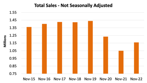 Unadjusted sales trends on a relative basis are in line with the last several months. November 2022 unadjusted sales are noticeably better than November 2021 but remain depressed compared to November 2015 through 2020. It’s likely that the gap between the pre-pandemic sales pace and the current sales pace will continue to narrow in 2023, but the rate at which improvements are expected throughout the next year remains unclear. As we have learned over the past two and a half years, no one truly knows what to expect regarding geopolitical events and OEM decision-making that impact inventory availability and consumers’ demand for automobiles. Simply put, expectations for the next year of selling should be cautiously optimistic.