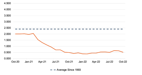 The industry’s inventory-to-sales ratio, a metric released with a one-month lag, actually fell in October 2022 due to a significant improvement in last month’s sales pace (as elevated sales outran inventory production over the month). Going forward, we believe that a return to the long-run average inventory-to-sales ratio of 2.41x is very unlikely in the near term or throughout 2023. Given how auto dealer profitability has thrived in the low-inventory environment, we find it increasingly likely that a fundamental shift in the industry has already occurred. What if auto dealers never return to the days of 2-3x monthly sales worth of inventory on the lot? The last two years have informed us that dealers can thrive in this environment, but only time will tell us how sustainable this success may or may not be, particularly considering how profits are split between dealers and OEMs.