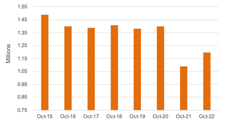 The October 2022 SAAR was 14.9 million units, up 12.7% from October 2021 and up 9.8% from last month. This month’s SAAR comes as a bit of a surprise, as the last three months’ sales pace settled at around 13.4 million units and seemed to have stabilized at a short-term equilibrium. However, meaningful improvements in inventory balances and other tailwinds like natural disaster-related demand contributed to the second-highest monthly SAAR total this year. For perspective, from 2014-2019, there were zero months where SAAR was below this recent high in the inventory-constrained 2022.