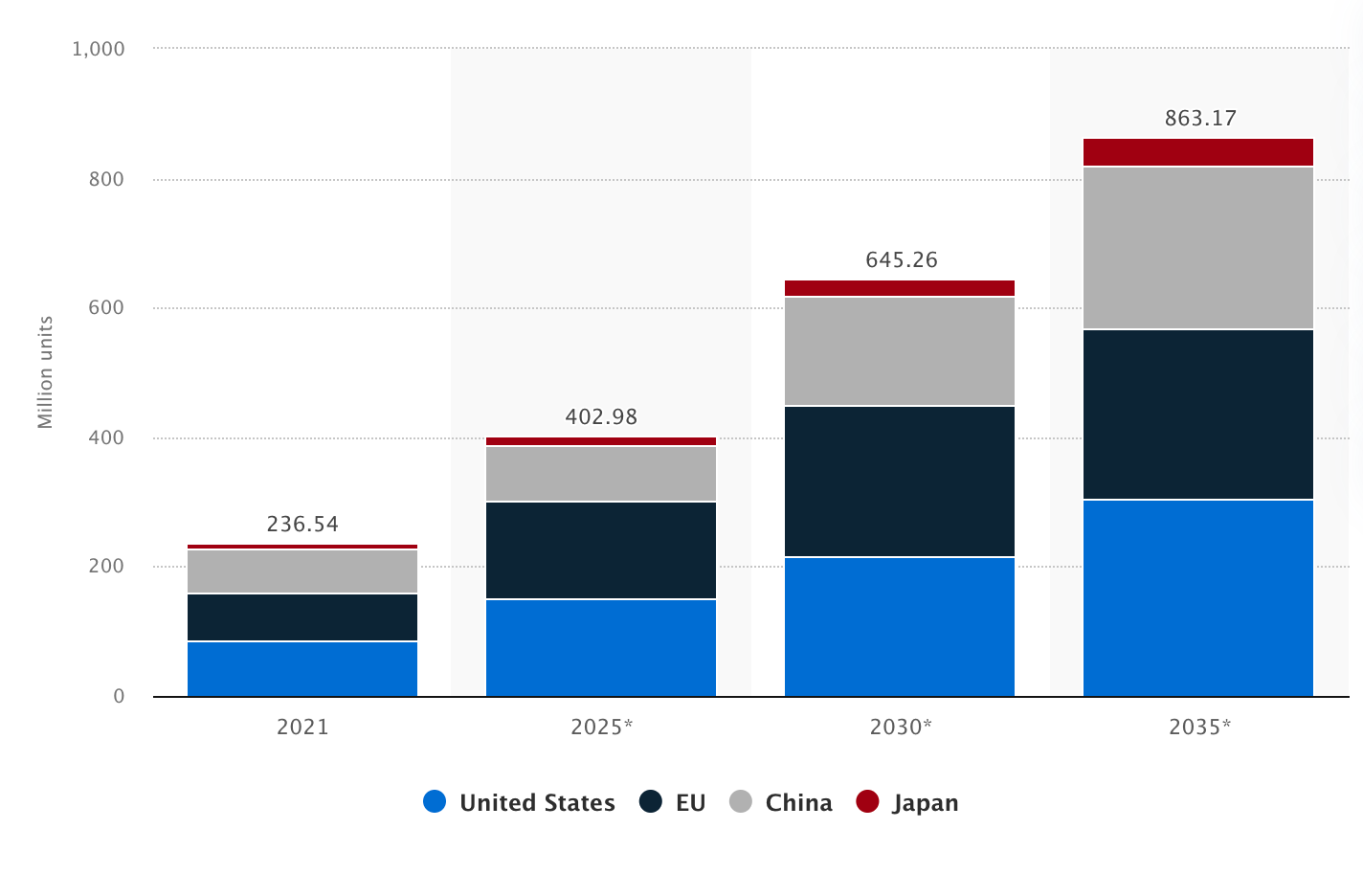 Size of the Global Connected Car Fleet in 2021, With a Forecast for 2025, 2030, and 2035, by Region