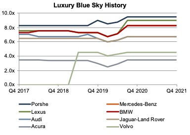 Pre-COVID and chip shortage, it would be no surprise if Blue Sky multiples remained stable over numerous quarters for many brands. As seen in the charts later in this post, multiples normally don’t tend to shift dramatically on a quarterly basis. Multiples are dependent on numerous factors, though brand desirability is chief among them. This is usually tied to product lineup and the overall effectiveness of the OEM.